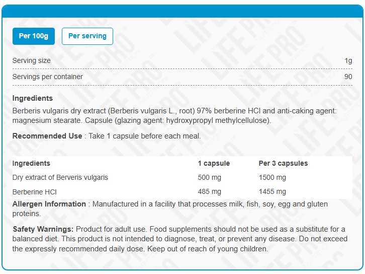 Consume 500 mg of berberine (1 capsule) 2 to 3 times a day.