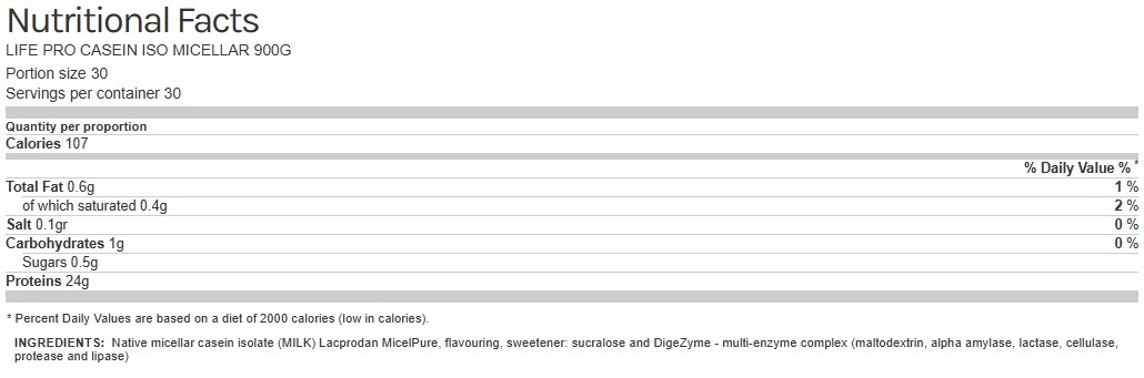 Isolate Micellar Zero has not been mixed with whey protein . It is an excellent source of this macronutrient, with a high purity of 95% in micellar casein, making it a micellar casein, and not a milk protein. It contains around 80% protein depending on the chosen flavor.