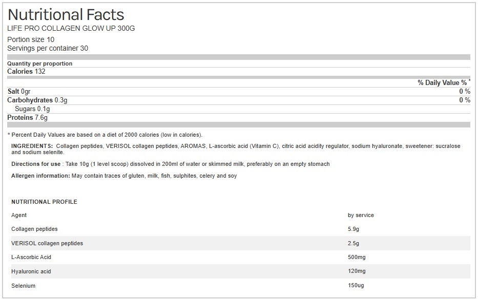 Glow Up is a supplement focused on improving the antioxidant capacity of our body and creating a better cellular environment. Within its composition, the highly bioactive collagen peptides of the Verisol ® patent stand out. The producer of this patent has different raw materials, each supported by scientific publications, with a specific purpose. In this sense, Verisol ® is precisely the most studied collagen with the greatest positive effects today.