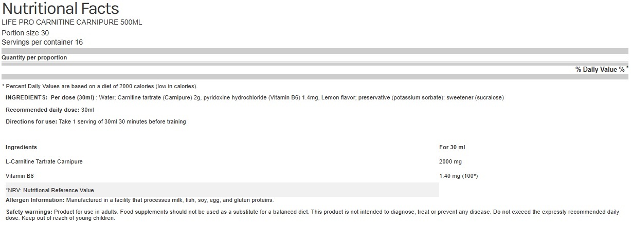 Life Pro Carnitine Carnipure allows the athlete to be more attentive and can improve their performance thanks to this energy boost.