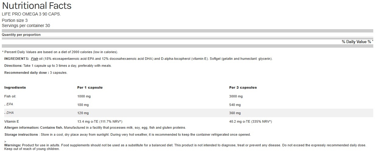 Life Pro Omega 3 is an ideal supplement for people with a diet low in fatty acids, who do not consume enough fish or oils rich in Omega 3.